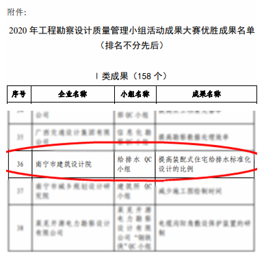近日,中國(guó)勘察設(shè)計(jì)協(xié)會(huì)公布了2020年工程勘察設(shè)計(jì)質(zhì)量管理小組活動(dòng)成果大賽結(jié)果,我院給排水QC小組申報(bào)的《提高裝配式住宅給排水標(biāo)準(zhǔn)化設(shè)計(jì)的比例》課題榮獲2020年全國(guó)工程勘察設(shè)計(jì)質(zhì)量管理小組活動(dòng)成果大賽I類(lèi)成果獎(jiǎng)。
