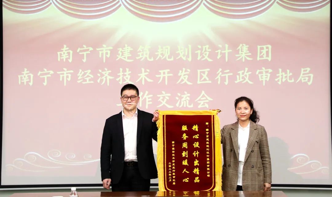近日,南寧經(jīng)濟技術(shù)開發(fā)區(qū)行政審批局局長何建匯率部門相關(guān)負責人一行蒞臨我集團公司交流指導,對我集團在配合南寧經(jīng)開區(qū)開展“拿地即開工”活動中的服務表現(xiàn)給予了充分肯定,并向我集團贈送錦旗以示鼓勵。