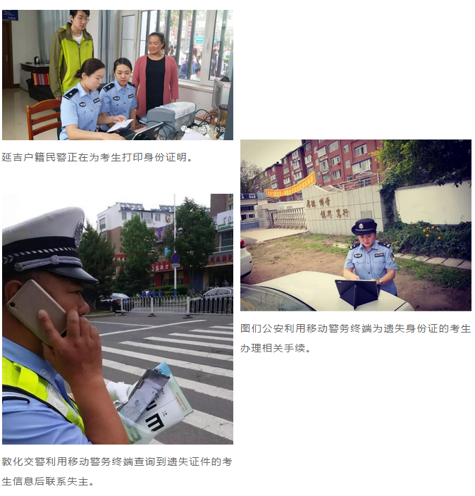今年高考,延邊全州公安戶(hù)政管理部門(mén)在8縣(市)11個(gè)高考考場(chǎng)全部設(shè)立了現(xiàn)場(chǎng)服務(wù)點(diǎn),安排了26名戶(hù)籍民警利用移動(dòng)警務(wù)終端為考生提供全程實(shí)時(shí)服務(wù)。