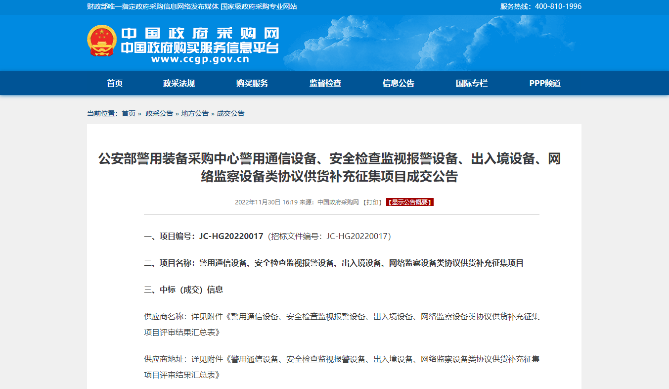 近日,中國政府采購網(wǎng)發(fā)布“公安部警用裝備采購中心警用通信設(shè)備、安全檢查監(jiān)視報警設(shè)備、出入境設(shè)備、網(wǎng)絡(luò)監(jiān)察設(shè)備類協(xié)議供貨補充征集項目成交公告”,海鄰科自主研發(fā)9個型號的智慧警務(wù)執(zhí)法產(chǎn)品成功入圍公安部警用裝備采購中心。