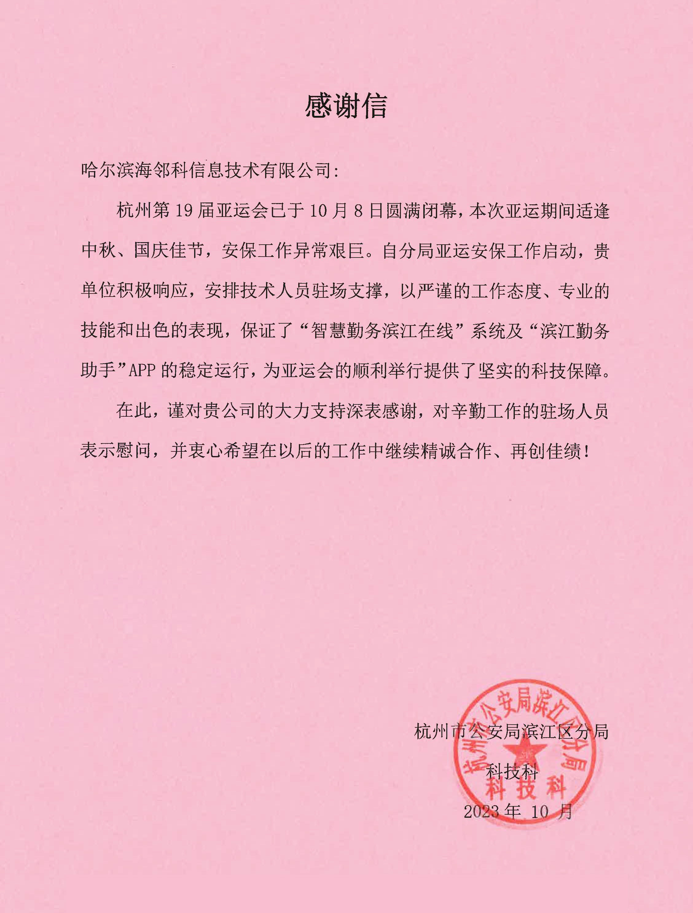近日,海鄰科集團收到了一封來自杭州市公安局濱江區(qū)分局的感謝信。舉世矚目的第 19 屆亞運會于10月8日圓滿閉幕,亞運會期間,海鄰科項目團隊以出色的專業(yè)技能和優(yōu)異的工作表現(xiàn),獲得了杭州公安的高度肯定和盛贊,展現(xiàn)出海鄰科人精益求精的服務(wù)精神和良好的企業(yè)形象。海鄰科為杭州亞運安保交了一份滿意的答卷。