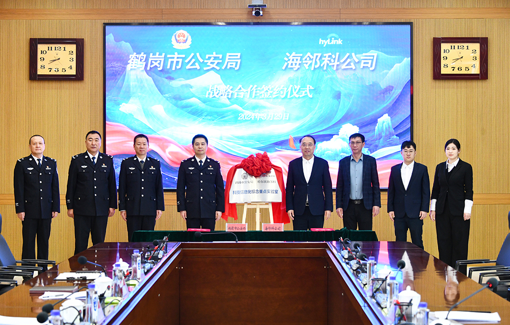 2024年3月29日,鶴崗市公安局與哈爾濱海鄰科信息技術(shù)有限公司(簡稱“海鄰科”)舉行戰(zhàn)略合作簽約暨“科技信息化綜合重點實驗室”揭牌儀式。鶴崗市副市長、市公安局黨委書記、局長陳偉宏,海鄰科董事長兼總裁張海軍出席儀式,代表雙方簽約并致辭。
