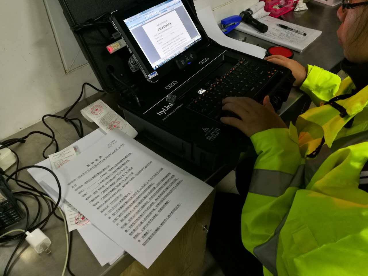 11月25日晚上,疊彩交警大隊(duì)在北極廣場(chǎng)設(shè)卡開展綜合整治行動(dòng),期間查處酒駕行為兩起,其它交通違法行為8起。與以往不同的是,此次交警查處酒駕行為,除了通過呼氣式酒精測(cè)試儀進(jìn)行測(cè)試和執(zhí)法記錄儀固定證據(jù)外,還使用了從深圳市海鄰科公司采購的一批國(guó)內(nèi)較先進(jìn)的公安平板電腦執(zhí)法一體箱!借此可以在現(xiàn)場(chǎng)完成信息查詢、制作詢問筆錄、打印處罰決定書等一系列流程。節(jié)省了傳統(tǒng)的將當(dāng)事人帶回大隊(duì)本部再做處理的時(shí)間和人力損耗,提高查處效率。