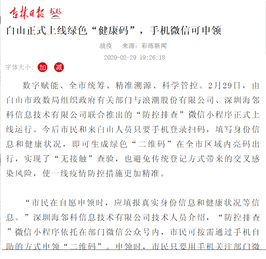 精準(zhǔn)防疫!海鄰科綠色“健康碼”白山上線
